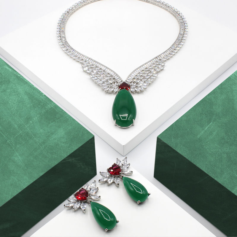 The Green Cuore is an elegant and distinctive piece, featuring a striking green teardrop shaped stone as its centrepiece. This eye-catching gem is beautifully complemented by a small, vibrant heart-shaped red stone, adding a subtle touch of passion and romance. Its unique design blends grace with charm, making it a perfect statement accessory for any occasion. The interplay of green and red creates a bold yet refined look that captures attention effortlessly. Whether worn for a special event or as a signature piece, the Green Cuore brings a sense of timeless beauty and heartfelt emotion to any jewelry collection